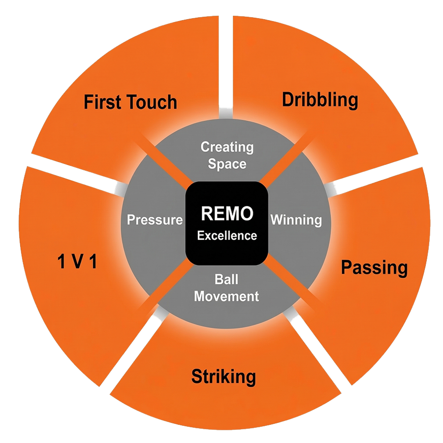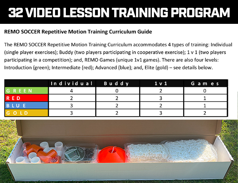 The Remo Trainer lets players get 3,000+ weekly touches to improve dribbling, passing, 1v1, first touch, and shooting, plus a 32-video lesson training program.